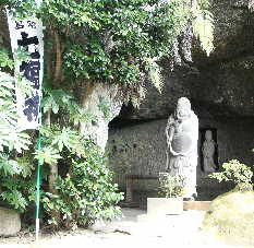 散策路は書院・庫裏の周りを回って庫裏の前で布袋尊への参拝路が分岐します。その路をたどるとやぐらの中に笑顔でたたずむ布袋尊を見ることができます。 鎌倉江ノ島七福神の一つです。 |