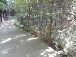 公園南口付近の「馬の背の小径」との分岐から「のんびり小径」を進み、湖畔を目指します。 分岐からは急な下りさかを下りますが、すぐに緩い下り道になりそれが湖畔まで続きます。道は急傾斜の山腹をまいてつけられていて、途中、岩場を横ぎったり、桟道があったりして変化があります。整備されていて歩きやすくのんびり歩けます。やがて、道幅が広くなり、左手に湖畔にある公園管理事務所が見えてきます。そのすぐ先が湖畔側の「馬の背の小径」との分岐です。 |