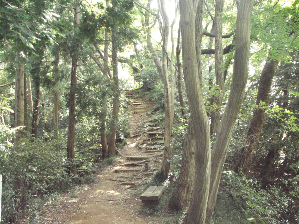 公園南口は、園地内の比較的標高の高いところの今泉台の住宅地との境にあります。「半僧坊下」バス停(JR大船駅から江ノ電バス「鎌倉湖畔循環」にて)までは100mほどです。南方向に天園ハイキングコースがあり、天園ハイキングコースの今泉台6丁目公園入口までは住宅地内を歩いて300mほど、今泉台4丁目入口までは500mほどです。住宅地内を東方向に1000mほど進むと六国見山の登山口に行くことができます。東方向に進み明月谷の道を下りていくと北鎌倉方面に至ります。JR北鎌倉駅までは25分ほどです。逆に上ってくる場合は35分くらいはかかるでしょう。 公園南口から園地に入り、階段の道を上ります。上りきったあたりで左に「パノラマの小径」が分岐します。案内標識もあります。その先、下りになった道を進むとすぐに鞍部になりまた道が分岐します。道なり方向の尾根筋の道が「馬の背の小径」、右方向に下っていく道が「のんびり小径」です。ここにも案内標識があり、道なり方向に「馬の背の小径 約700m」、右方向に「のんびり小径 約800m」とあります。 |