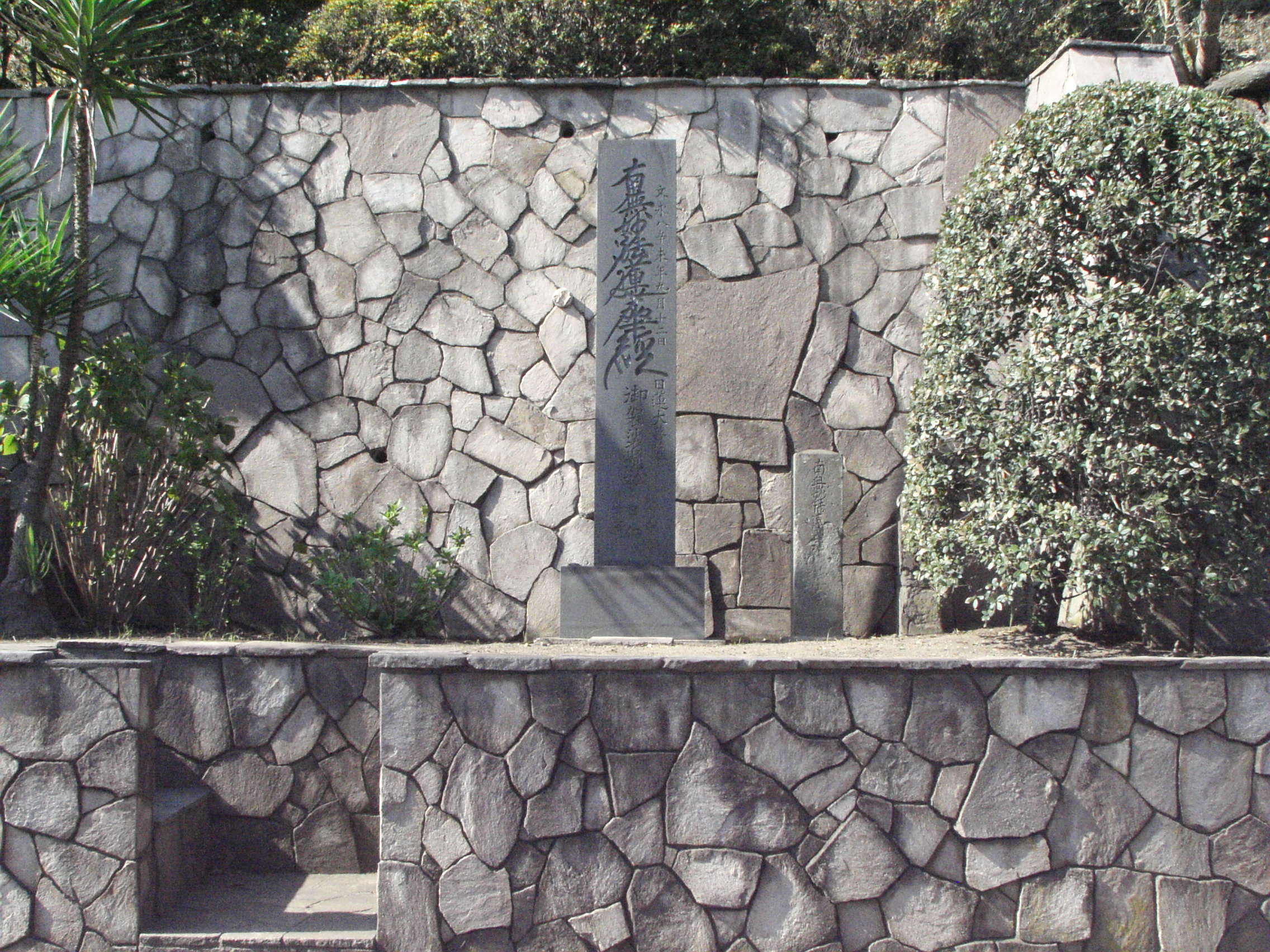 針摺橋から七里ヶ浜方面に進み150mほど、右側斜面の石垣に石塔が並び置かれてあるところが日蓮袈裟懸松(にちれんけさがけまつ)跡です。石塔には「南無妙法蓮華経 日蓮大菩薩 御袈裟懸松」と彫られています。