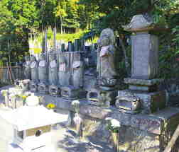 庫裡と不動堂の間を通り裏手に行くと墓地が広がります。すぐのところに六地蔵、地蔵像の石像や石塔が並んであります。左手の奥の山崖にいくつもの立派なやぐらあるのが見えます。やぐらの中や付近には古い石塔、石仏が並んで建っています。それらには元禄や享保などの年号を表す文字を見ることができます。 |